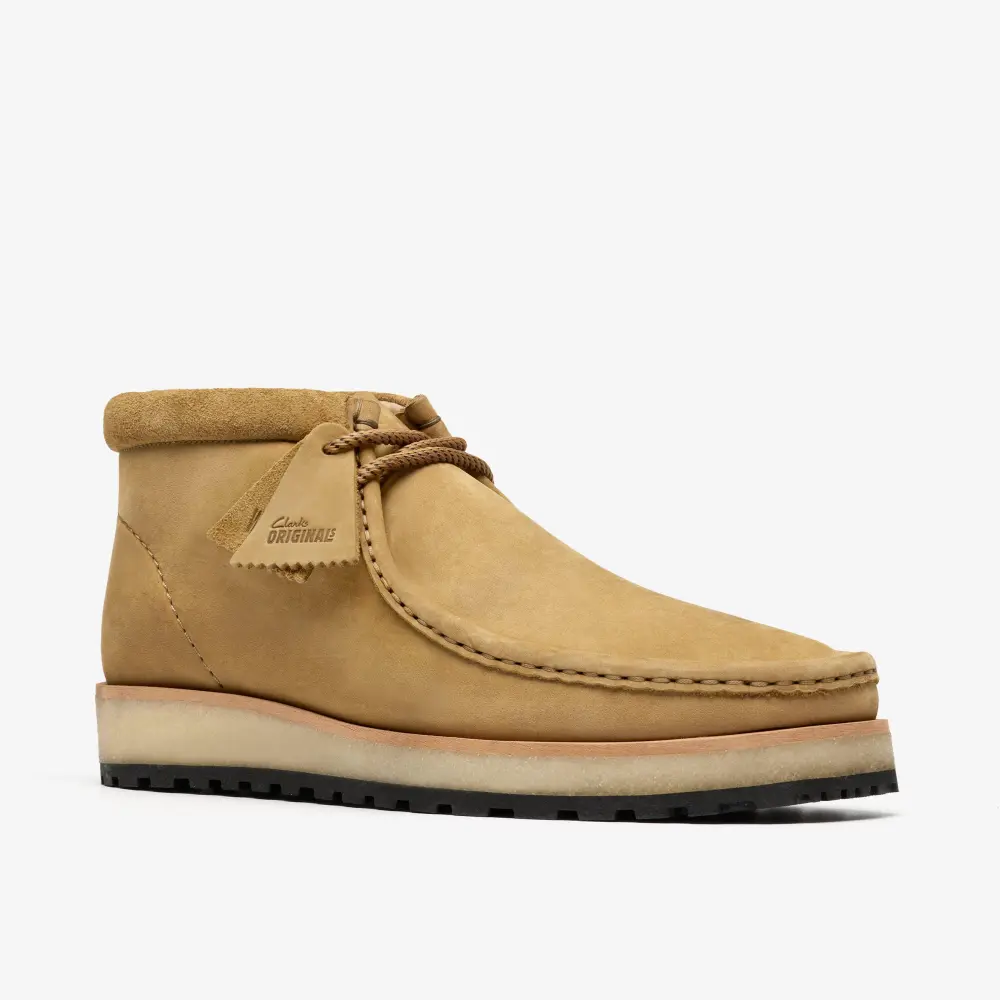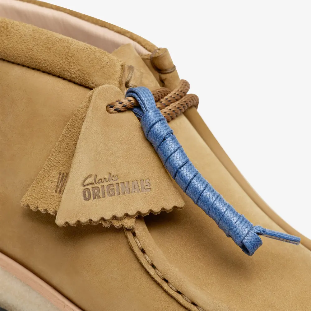 The shoe also features two distinctive FOBs—Clarks Originals and Wallabee™—and is completed with the Clarks Originals logo on the sock, showcasing its authentic heritage.