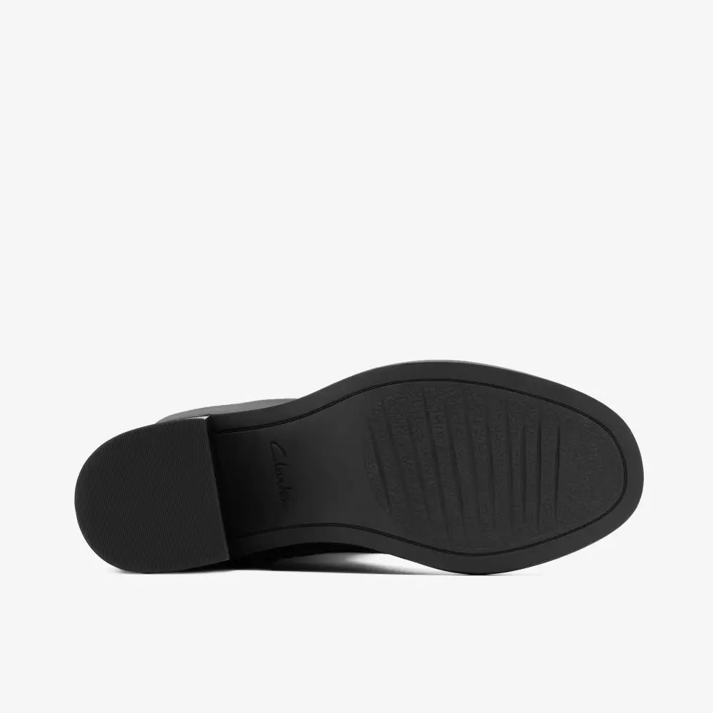 Elevate weekday or evening dressing with classic knee high boot Chamberly Hi. A luxe black leather upper and stacked heel deliver a premium, timeless finish, completed with a pillowy foam footbed for signature round-the-clock Clarks comfort.