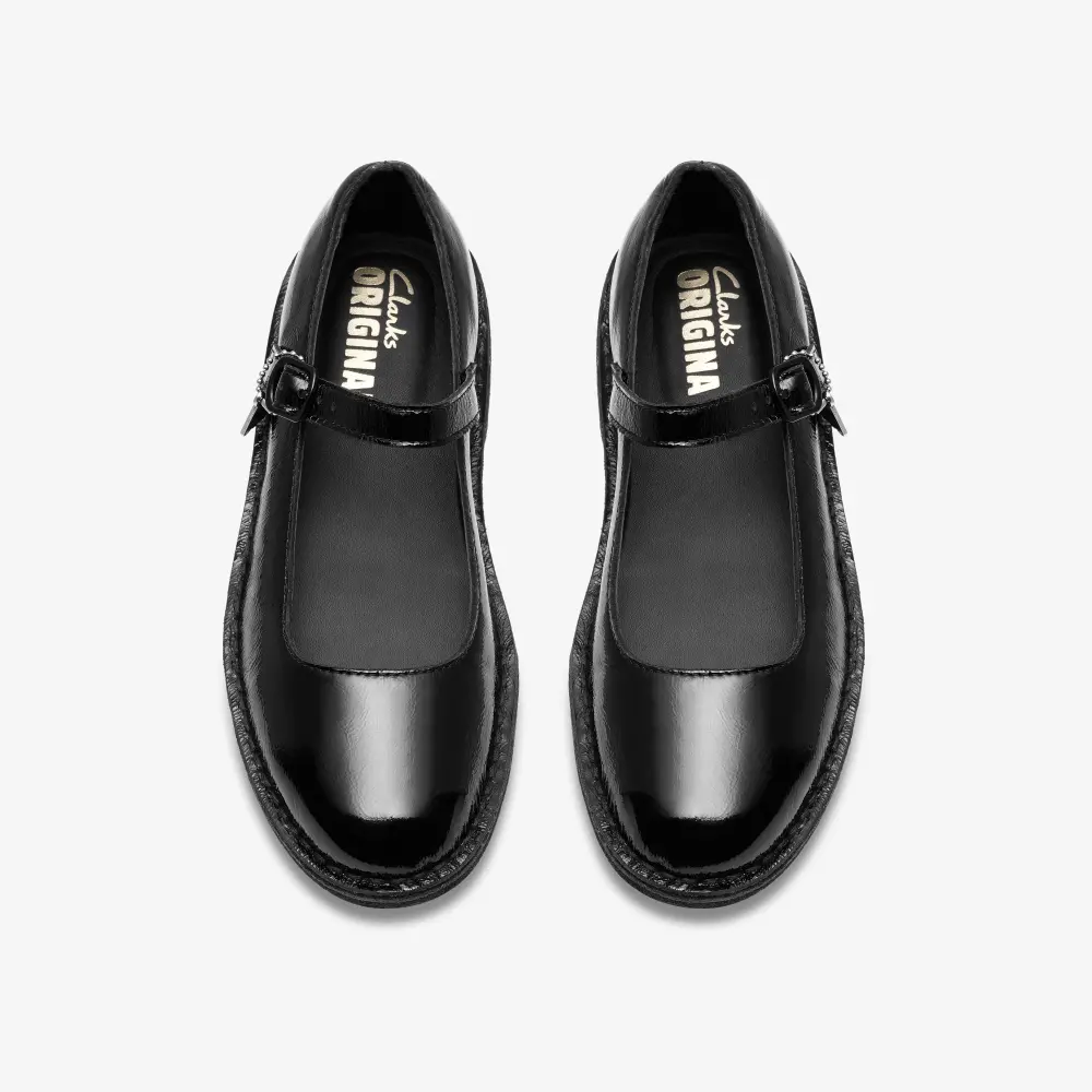 The Desert Jane features a luxurious crackled patent upper that catches the light beautifully, offering a unique texture and shine. Its metal buckle fastening ensures a secure fit, while the metal silver FOB on the strap adds a chic detail that enhances its sophisticated appeal. The smooth black crepe sole provides both comfort and flexibility for all-day wear.